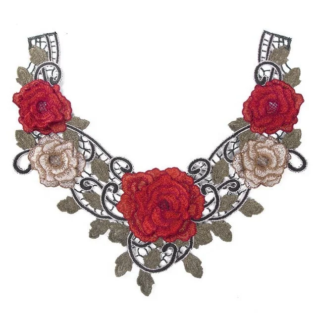 Fashion Polyester Red Rose Embroidery Floral Lace Collar Trim DIY Applique