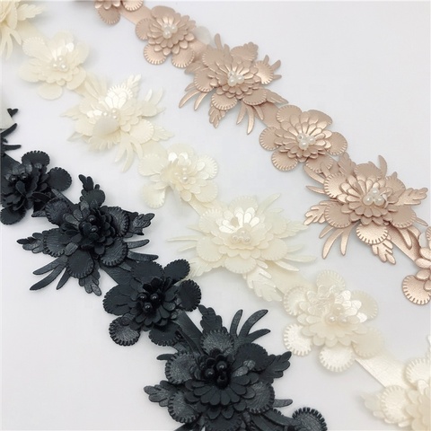 5cm Decorative Black Gold White PU 3D Flower Beaded Lace Trimming
