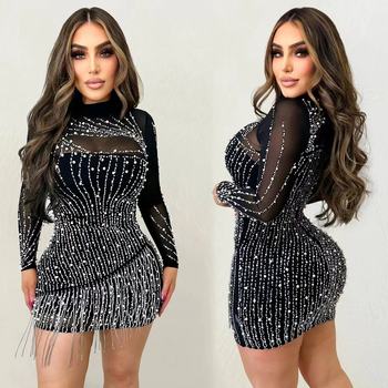 Màu Đen Dài Tay Áo Của Phụ Nữ Sexy Câu Lạc Bộ Đêm Bodycon Rhinestone Dress Với Cao Căng Lưới Kim Cương Váy